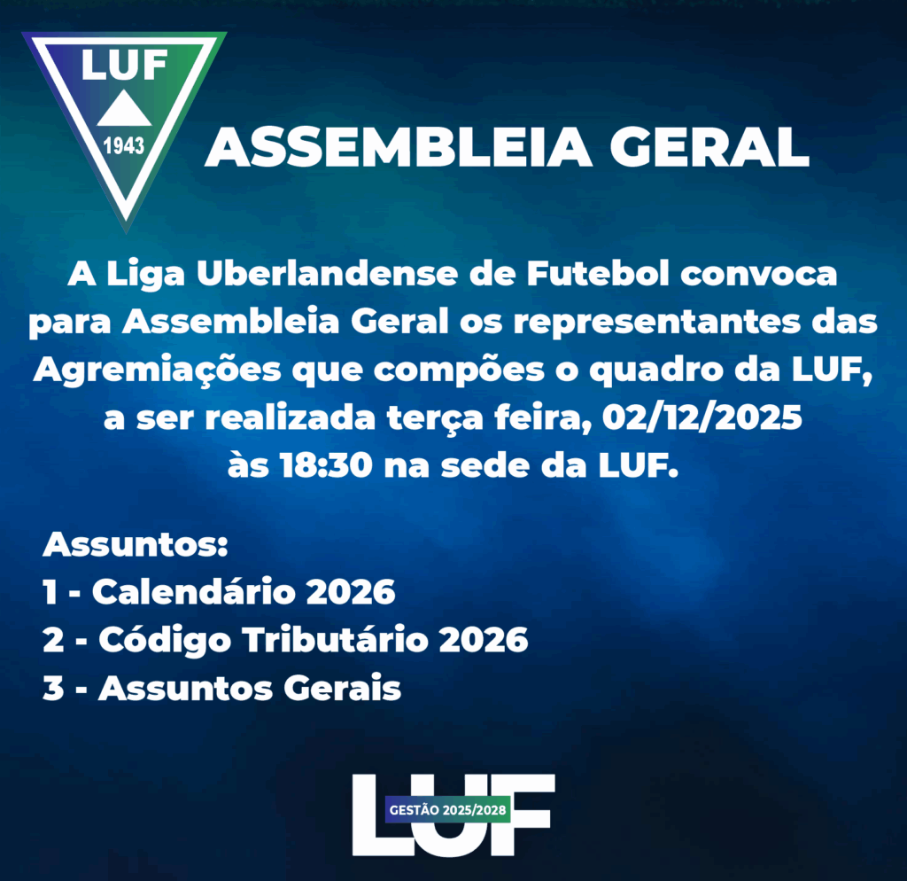 A Liga Uberlandense de Futebol convoca para Assembleia Geral os representantes das Agremiações que compões o quadro da LUF, a ser realizada terça feira, 02/12/2025 às 18:30 na sede da LUF. Assuntos:
